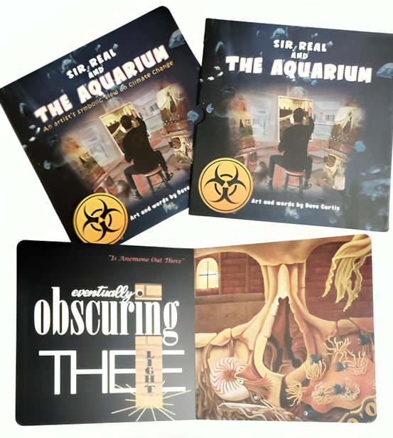 For one year, starting in April 2017 and ending in May 2018, artist Dave Curtis began his first “epic” series of 12 paintings with his surreal artwork, which has been dubbed “Sir Real and The Aquarium.” This series symbolically dealt with the rather ominous topic of climate change, which has been recognized internationally as the most pressing topic of our time. Dave attacked this topic in an interesting manner that becomes obvious as you advance through the series. As with most of Curtis’ work, there is more to the art than what first meets the eye, and spending time with each piece of art will prove very thought-provoking.